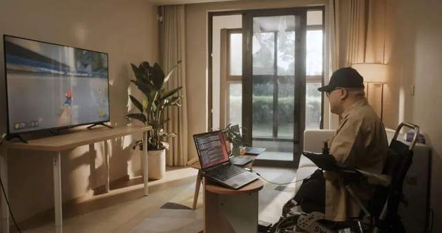 4月30日,在位于上海的受试者住所,受试者通过脑机接口玩赛车游戏。新华社发(戴焱淼 摄)