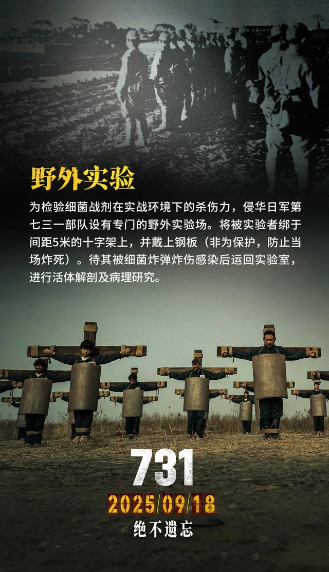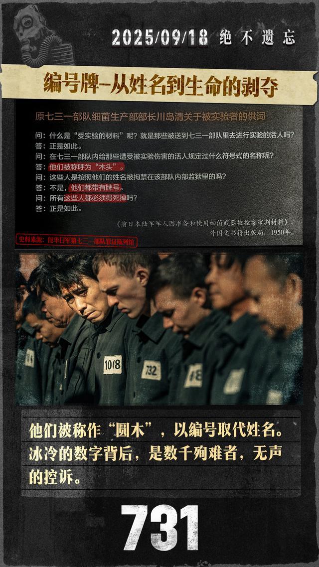电影《731》里,被关在四方楼里的人们,无论男女老幼,也无论国籍,一律被抹去了姓名,只留编号。其中,孙茜饰演的林素贤编号1213,那是南京大屠杀的日子,而她腹中胎儿的预产期8月15日,是日本宣布无条件投降的日子。