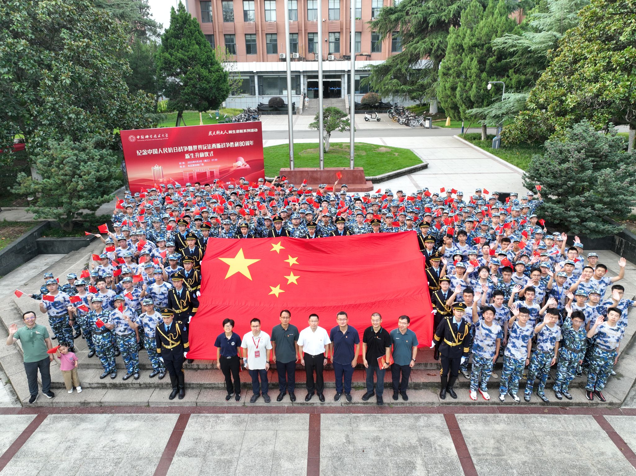 为进一步加强新生爱国荣校教育,激励同学们传承弘扬抗大精神、“两弹一星”精神和科学家精神,9月3日上午,学校在东区郭沫若广场举行纪念中国人民抗日战争暨世界反法西斯战争胜利80周年新生升旗仪式。校党委副书记周丛照出席,仪式。化学与材料科学学院党委书记徐允河、党委副书记范煜,少年班学院党总支副书记徐晶芝,党委人民武装部副部长、学生工作部(处)副部(处)长林高华,校团委副书记刘珊珊,军训团办公室工作人员,相关新生班主任,相关营连教官和2025级新生代表等共同参加仪式。