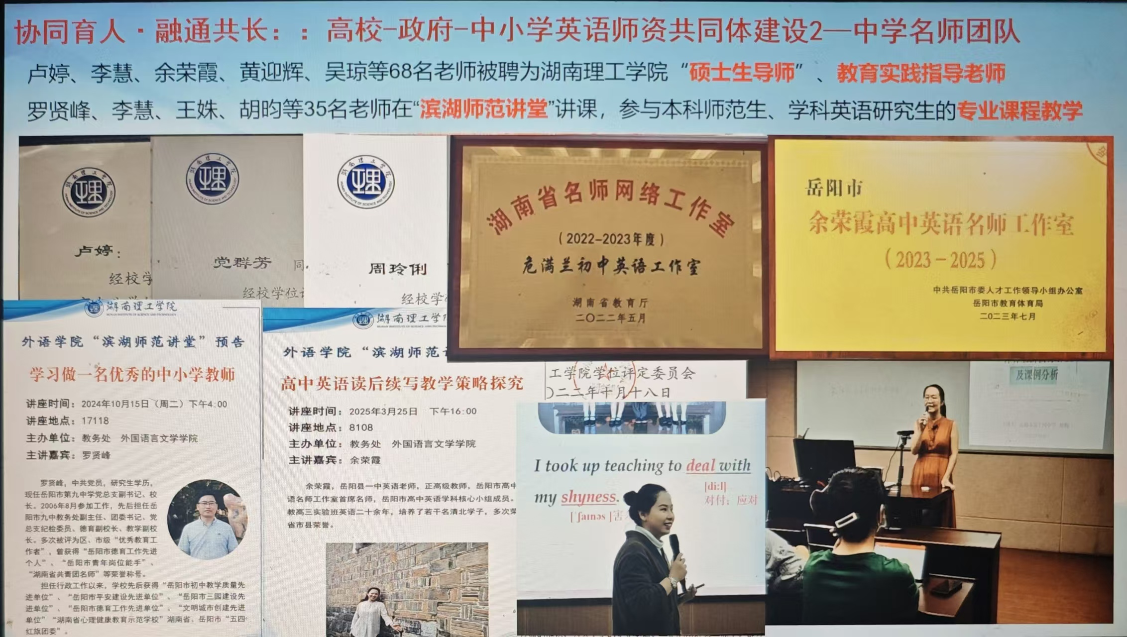 依托“U-G-S”三维协同体系,外国语学院实现“四大突破”:一是共享人才,打造师范教育师资队伍共同体;二是合力指导,提升师范生从教力新水平;三是双师互助,增强师范生教育实践力度;四是培训一体,搭建师范生职后发展新桥梁。欧阳建平教授团队于2024年成立英语教育研究所,专注中小学英语教育研究与实践,与岳阳市一中、岳阳县一中、岳阳中学、岳阳市九中、岳阳市十四中、岳阳市十五中、岳阳市十九中等开展深度交流,为区域英语教育发展提供理论研究、资源探索与技术支撑,使教研成果能迅速反哺课堂,推动大中小学教师共同体构建与教研高质量开展。